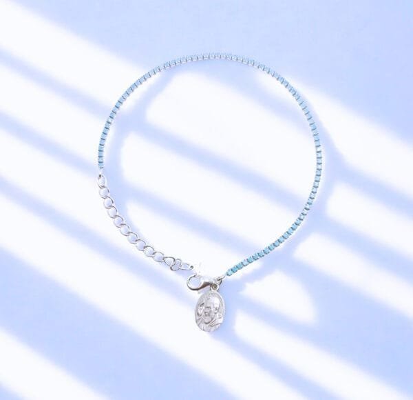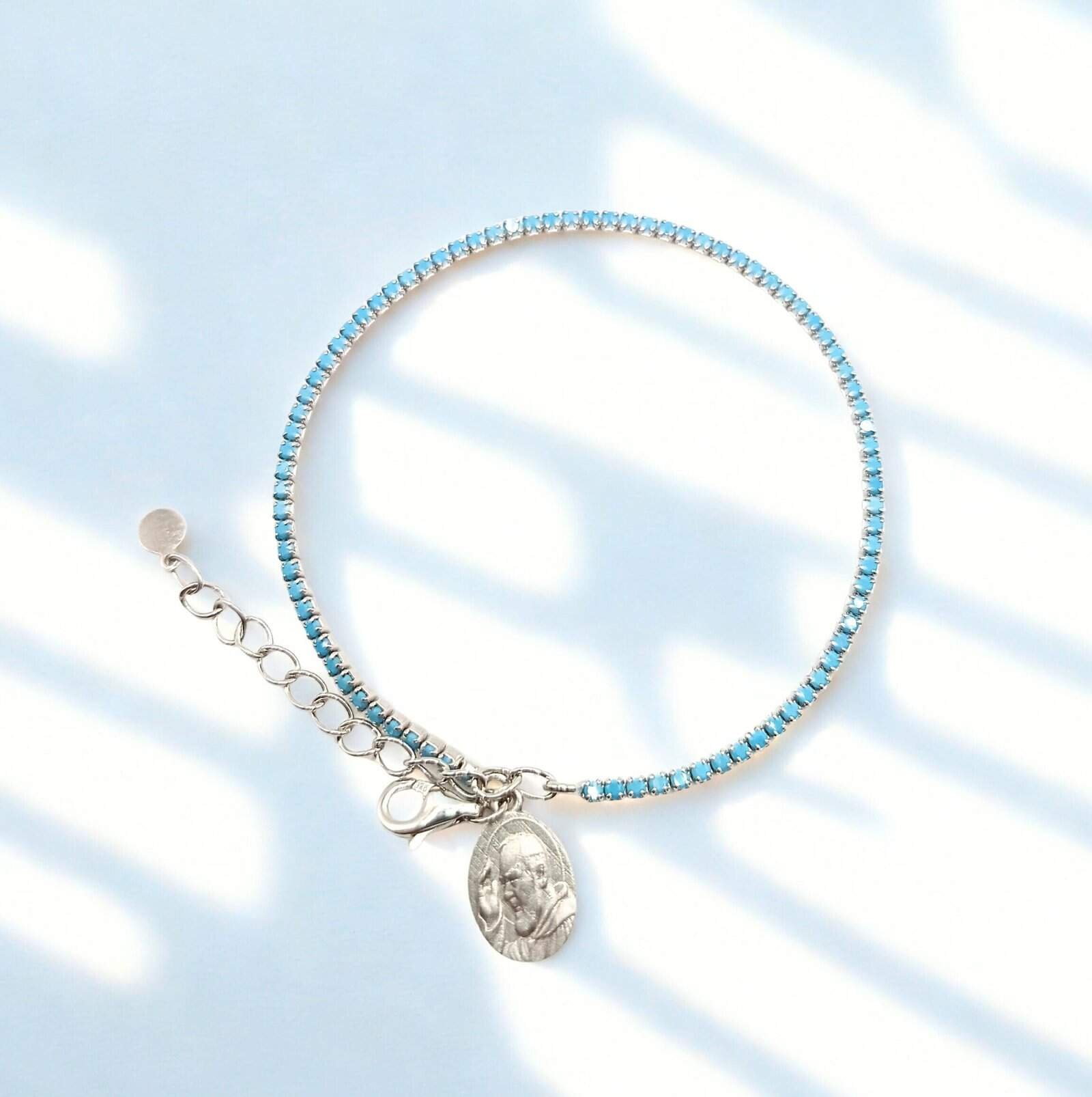 Bracciale Tennis in argento 925 rodiato con Micro Zirconi Celesti su tutta la lunghezza con medaglia raffigurante Padre Pio.