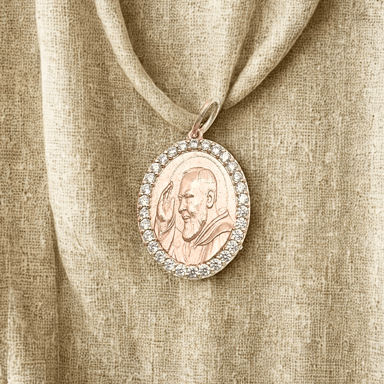 Medaglia Volto Padre Pio in Argento 925 placcata in oro rosa con zirconi bianchi.