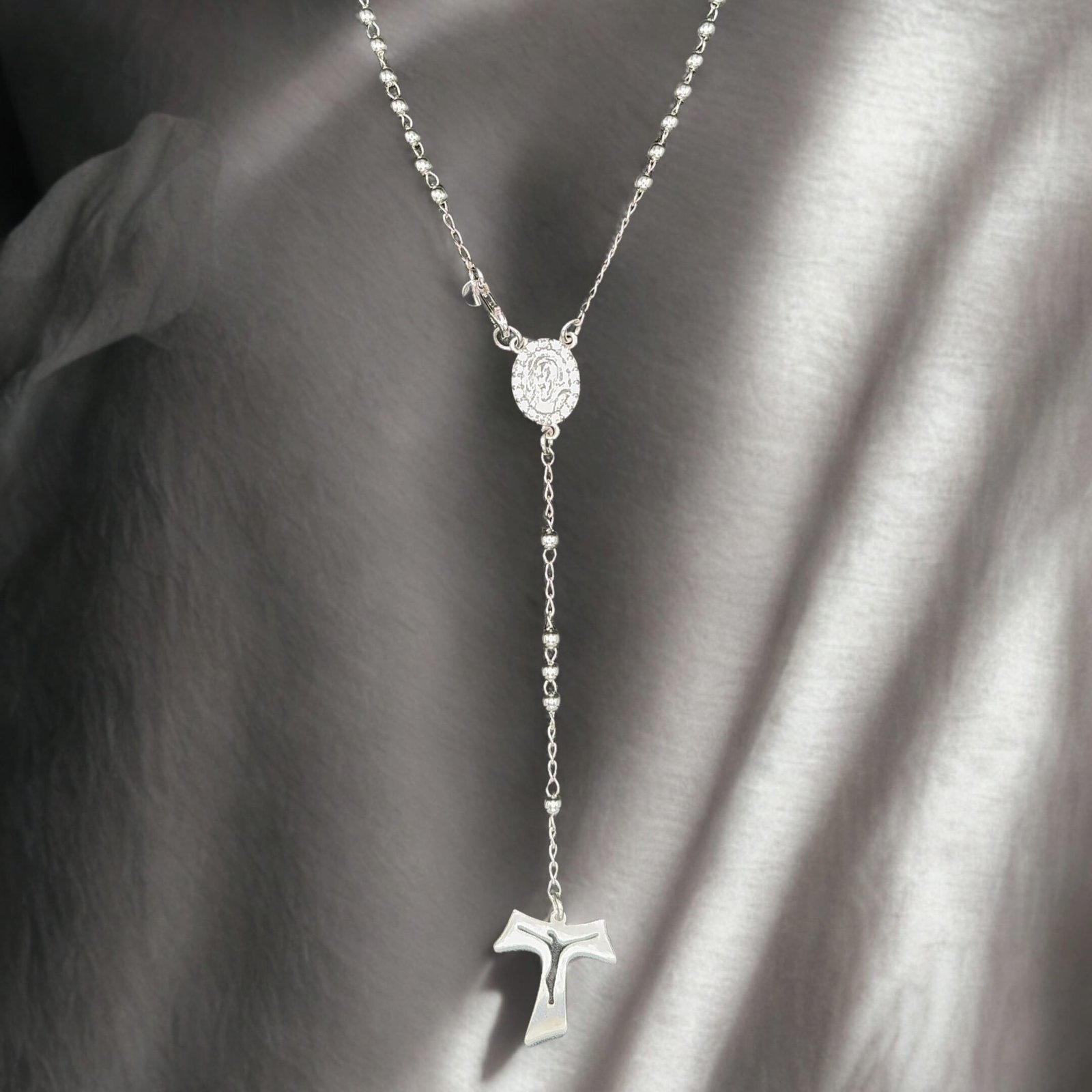 Rosario classico con medaglia PADRE PIO in Argento 925 rodiato con zirconi bianchi e croce Tau.